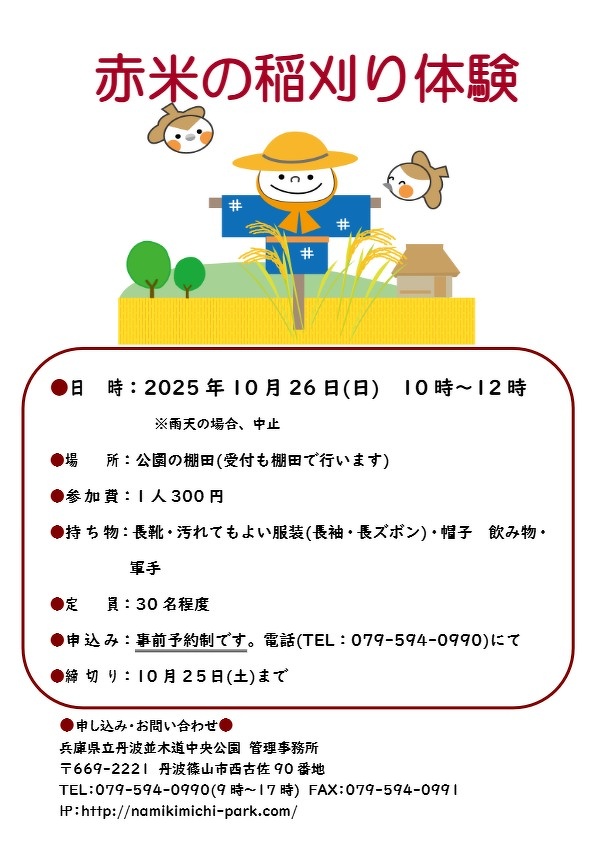公園の棚田で作った赤米の稲刈り体験です。 事前予約制(電話にて)となります。 受付は棚田で行います。 ※雨で中止の場合は当日8時までにHPでお知らせいたします。