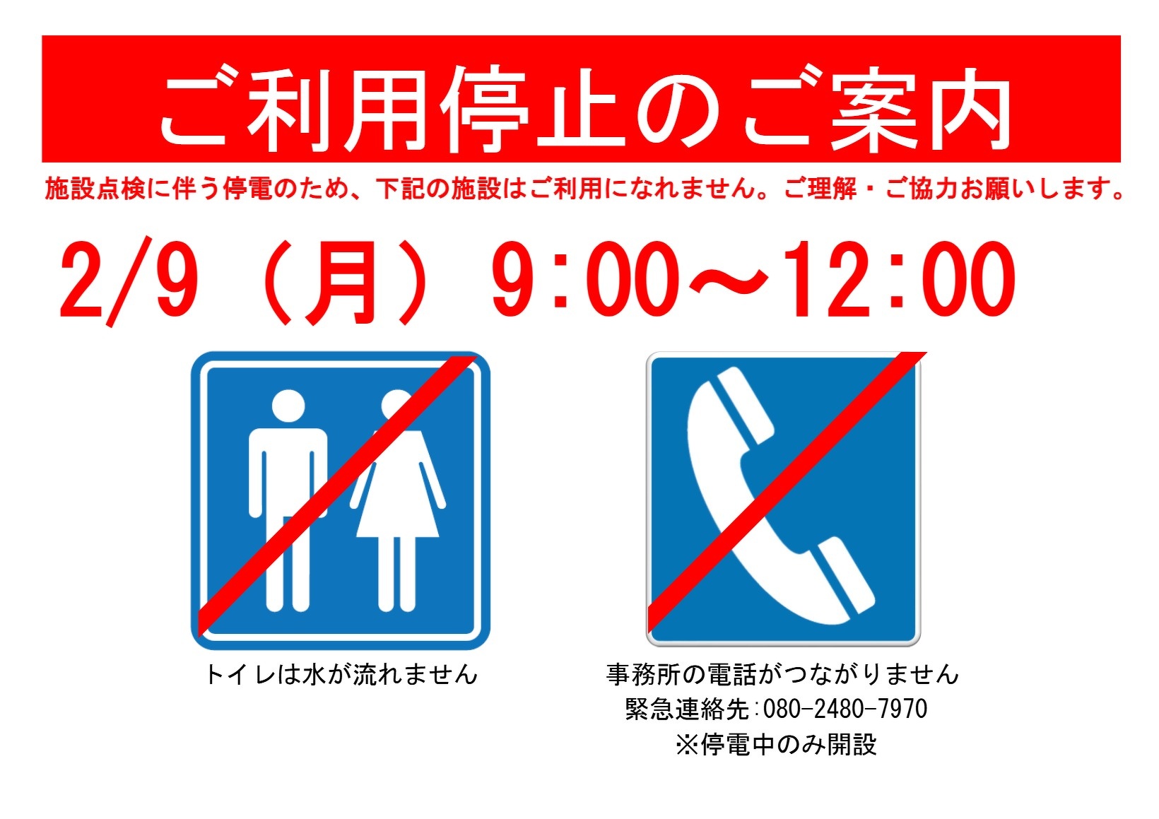 2月9日(月)午前中、公園内の電気設備点検のため、 園内のすべてのトイレ、手洗い場、電気機器が使用できません。 動く恐竜も午前中はお休みです。 大変ご不便をおかけいたしますが、ご理解ご協力のほどよろしくお願い致します。