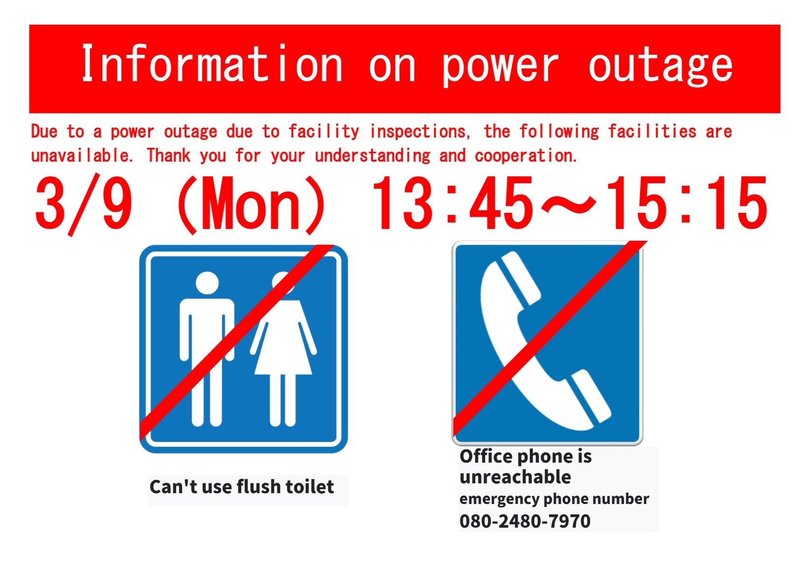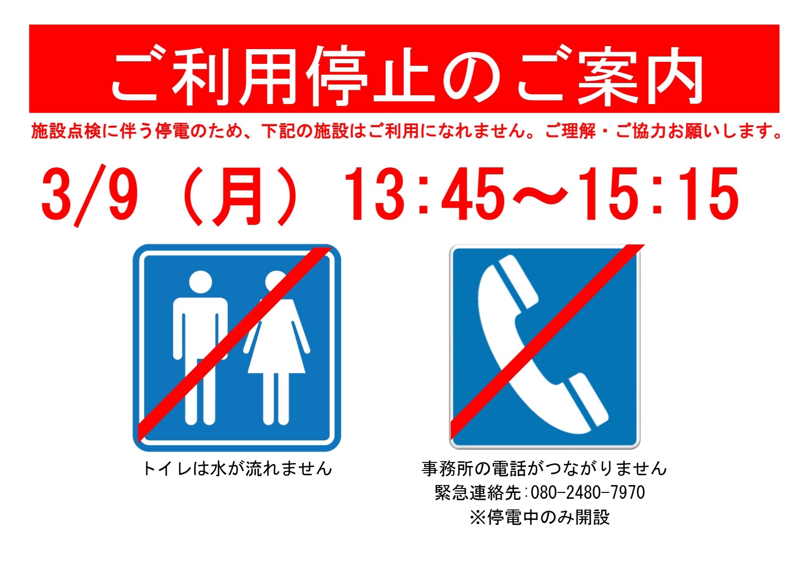 3月9日(月)13:45~15:15まで、公園内の電気設備点検のため、 園内のすべてのトイレ、手洗い場、電気機器が使用できません。 動く恐竜もこの時間帯はお休みです。 大変ご不便をおかけいたしますが、ご理解ご協力のほどよろしくお願い致します。